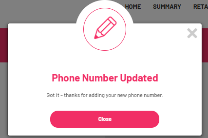 Once you’ve entered the OTP, a confirmation message will appear to let you know your number has been successfully updated. Click Close.