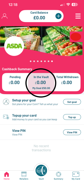 - On the website: Your Vault balance is displayed in the centre dial, along with your progress toward your goal.