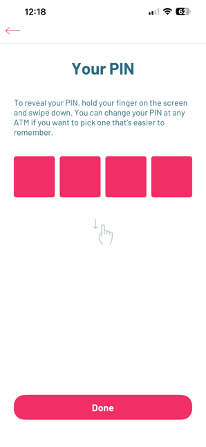 4. A screen with four boxes will appear. To reveal your PIN press and hold your finger on the screen. Swipe down and keep your finger connected. Your PIN will display while your finger remains on the screen. Once you lift your finger, the PIN will be hidden again.
