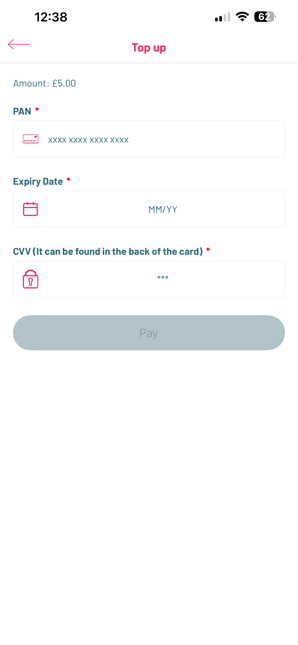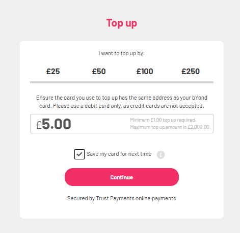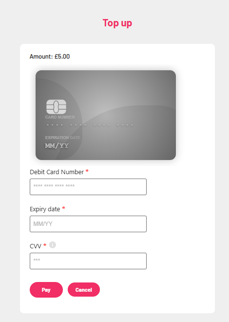 3. You’ll be redirected to Trust Payments, our secure payment services provider. Choose your card type and enter your card details. Make sure all details are correct to ensure your top-up is successful. Your top-up will go through a 3D Secure (3DS) check. Your bank may ask you to authenticate the transaction for security. This could involve entering a one-time passcode or using another method your bank supports. If your bank cannot match your details or declines the 3DS check, your top-up will fail. Tip: If declined, try again or contact your bank.